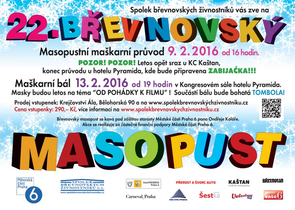 který vyrazí Břevnovem v úterý 9.února 2016 a letos bude mít stejně jako loni svůj začátek u KC Kaštan, Bělohorská 150. Sraz masek je v 15.45. V 16 hodin bude uděleno masopustní právo panem starostou a průvod se vydá za náležitého veselí masek i ostatních návštěvníků na svoji cestu po Bělohorské až k hotelu Pyramida, kde bude pochována basa. Průvod budou doprovázet bubeníci a další hudebníci. Dorazí i kejklíř Vítek se svoji družinou a dlouhorukými Chudadly a další maškary. Během průvodu bude pro masky připraveno občerstvení. Masopustní veselí bude ukončeno u hotelu Pyramida, kde na vás čeká pravá česká zabijačka s hudbou a tancem.