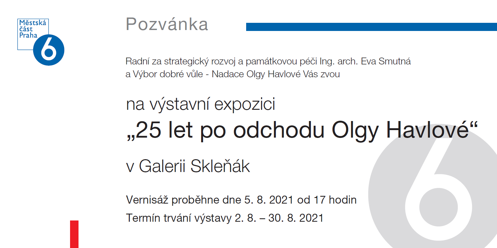„Paní Olga si v mládí prošla obtížnou životní zkouškou. Právě tato zkušenost jí pomohla brát život takový, jaký je. Byla velmi silnou osobností, která se nikdy nenechala zlomit a nikdy neztratila svou tvář. Za všech okolností zůstala sama sebou. Odmalička byla zvyklá pomáhat své rodině, přátelům. Její cit pro pomoc bližnímu byl mimořádně silný. V roli první dámy dostala příležitost pomáhat ve velkém těm nejpotřebnějším a bezmocným. Prostřednictvím Výboru dobré vůle se tak pomoc dostala k lidem, kteří by jinak neměli šanci něco ve svém životě změnit,“ komentuje výstavu, kterou městská část pořádá ve svých výstavních prostorách, radní Prahy 6 Eva Smutná.