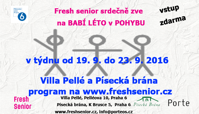 Fresh senior Vás srdečně zve na akci s názvem Babí léto v pohybu v týdnu od 19.09. do 23.09.2016 ve Ville Pellé a Písecké bráně viz program na www.freshsenior.cz. Vstup zdarma.