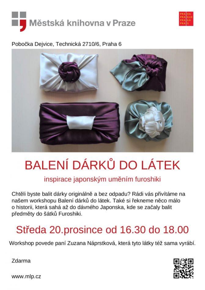 Chtěli byste si vyzkoušet balit dárky originálně a bez odpadu? Rádi vás přivítáme na našem workshopu Balení dárků do látek ve středu 20.12. od 16:30 v dejvické knihovně. Také si řekneme něco málo