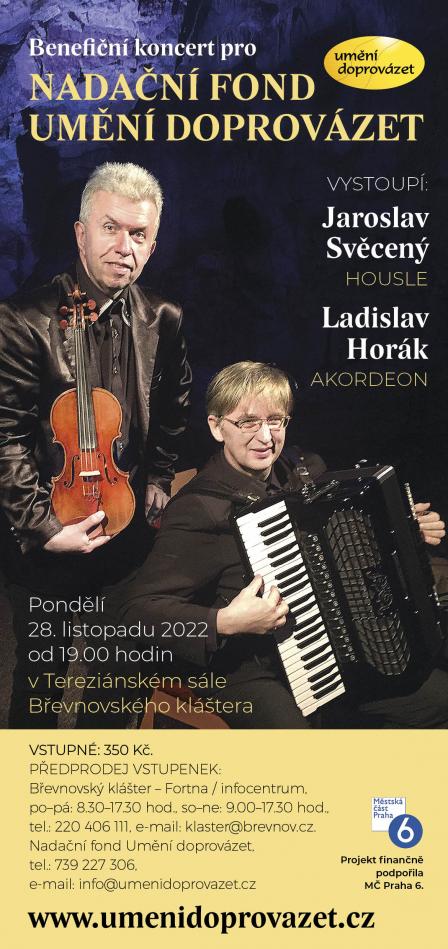 Nadační fond Umění doprovázet vás srdečně zve na tradiční benefiční koncert houslového virtuosa Jaroslava Svěceného, který pro nadační fond vystoupí za doprovodu skvělého akordeonisty Ladislava Horáka v pondělí 28. listopadu 2022 v Tereziánském sále Břevnovského kláštera.