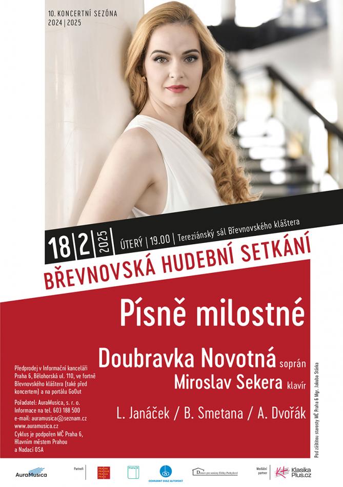 V úterý 18. 2. 2025 v 19.00 hodin zahájí v Tereziánském sále Břevnovského kláštera svoji jarní sezónu Břevnovská hudební setkání. V programu nazvaném Písně milostné, v němž zazní díla Leoše Janáčka, Bedřicha Smetany a Antonína Dvořáka, se představí sopranistka Doubravka Novotná, stálá sólistka opery Národního divadla v Brně a hostující sólistka dalších českých divadel, orchestrů a festivalů. Na klavír ji doprovodí Miroslav Sekera, přední český interpret, laureát mezinárodních klavírních soutěží, mj. nositel ceny z festivalu ve francouzském Gaillardu a vítěz mezinárodní soutěže J. Brahmse v Portschachu (SRN).