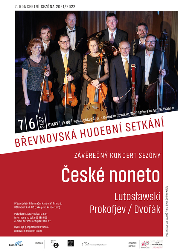 V úterý 7. 6. v 19.00 hodin přivítáme na závěrečném koncertu sezóny slavný soubor České noneto. Jak název napovídá, skládá se z devíti hudebníků, což je největší formace komorní hudby – housle, viola, violoncello, kontrabas, flétna, hoboj, klarinet fagot a lesní roh České noneto bylo založeno v roce 1924 tehdejšími studenty pražské konzervatoře. Dnes v něm hrájí členové nejvýznamnějších pražských orchestrů, České filharmonie, Symfonického orchestru hl. m. Prahy FOK, PKF-Prague Philhamonia nebo Symfonického orchestru Českého rozhlasu. Program koncertu je velmi atraktivní, zahrnuje dva „klasiky“ hudby 20. století a „klasika“ české romantické hudby - Witold Lutoslawski: Taneční preludia, Sergej Prokofjev: Kvintet g moll, Antonín Dvořák: Serenáda d moll, op. 44 (úprava F. Hertl).