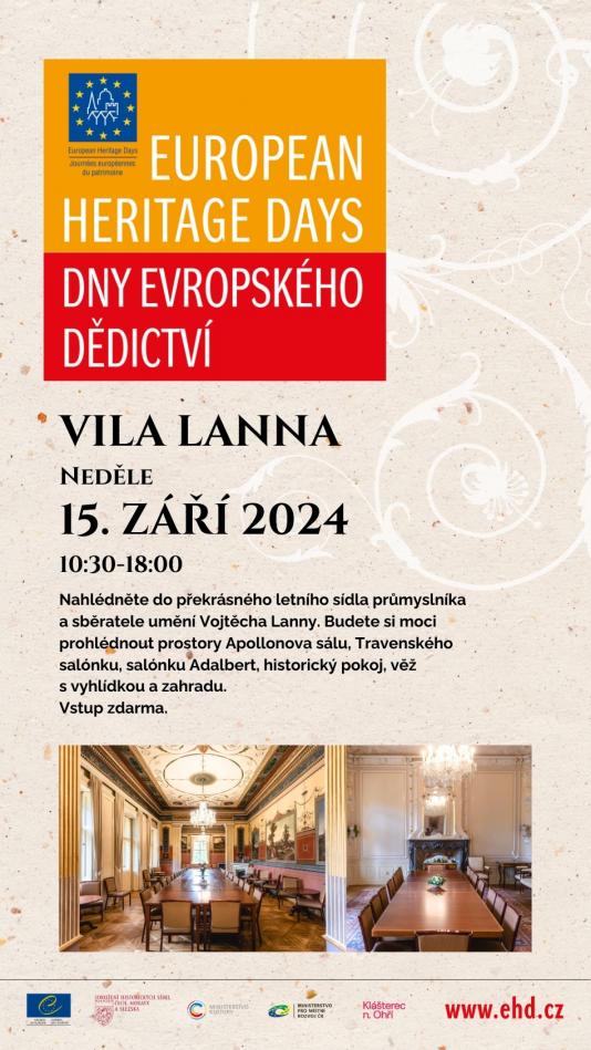 Památkově chráněná vila Lanna se v neděli 15. 9. 2024 opět zdarma otevře návštěvníkům v rámci Dnů evropského dědictví.