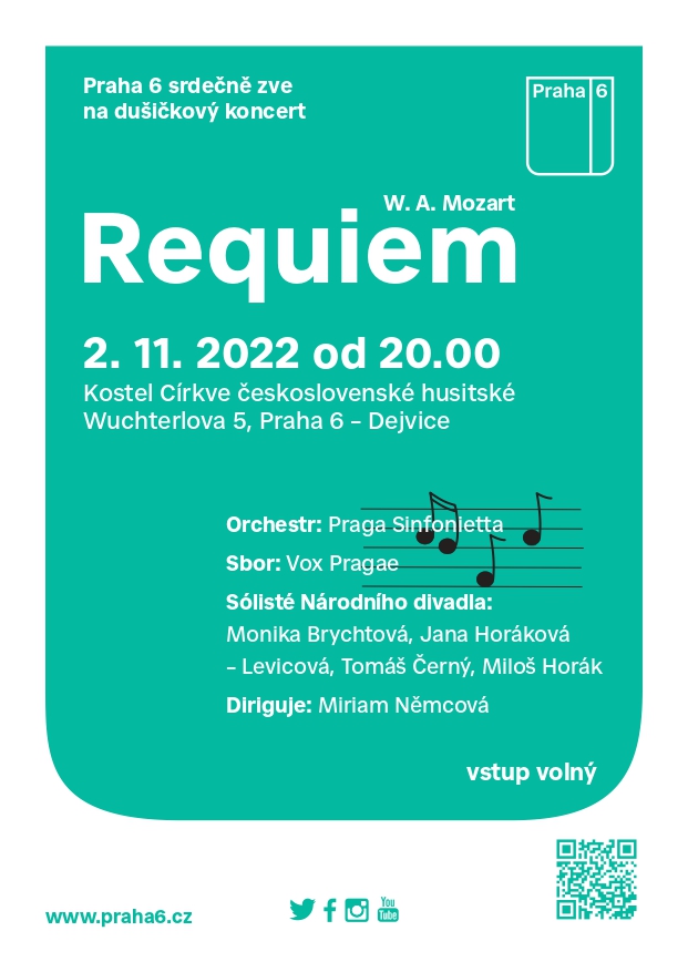 U příležitosti Svátku zesnulých zve Městská část Praha 6 na tradiční dušičkový koncert. Zazní Requiem W. A. Mozarta.