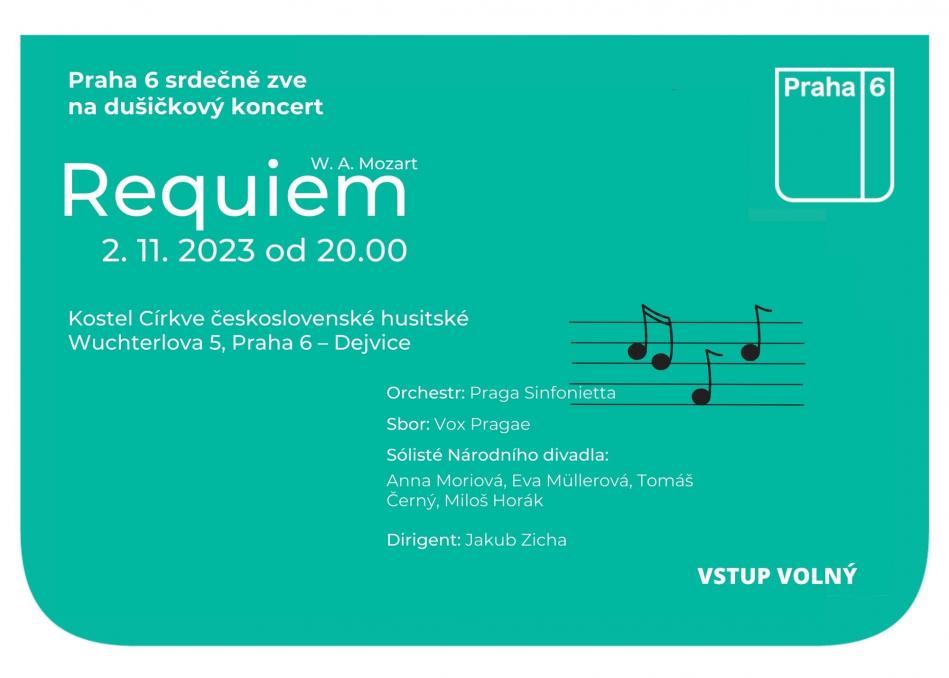 U příležitosti svátku zesnulých zve Městská část Praha 6 na tradiční dušičkový koncert v kostele Církve československé husitské ve Wuchterlově ulici 5 v Dejvicích. Zazní Requiem W.A. Mozarta.