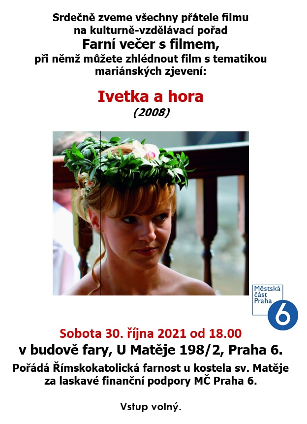 Srdečně zveme všechny přátele filmu na kulturně-vzdělávací pořad Farní večer s filmem, při němž můžete zhlédnout film s tematikou mariánských zjevení. Vstup volný.