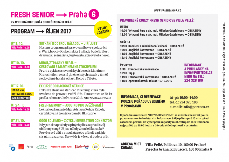 út – pá 10:00 – 14:00 na tel. č. 224 326 180 nebo na info{zavináč}porteos{tečka}cz , www.freshsenior.cz