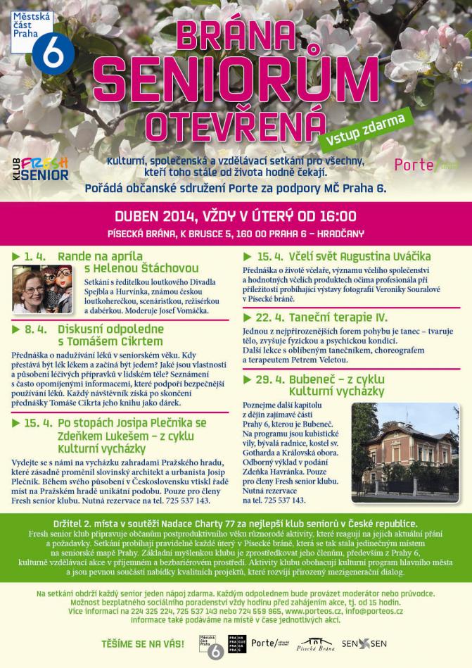 Pravidelné kulturní a společenská setkání pro všechny, kteří tiho stále od života hodně čekají. Program na duben až červen 2014 - každé úterý od 16hod v Písecké bráně, K Brusce 5, Praha 6 - Hradčany.