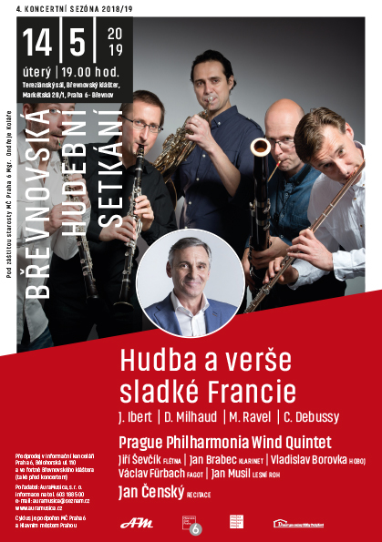 Další koncert Břevnovských hudebních setkání je za dveřmi, poprvé na našem festivalu uslyšíme klasicky sestavený dechový kvintet. Prague Philharmonia Wind Quintet, sdružení skvělých muzikantů z Pražské komorní filharmonie (z nichž někteří již dnes „sedí“ v té větší filharmonii) a známý herec Jan Čenský připravili program Hudba a verše sladké Francie, v němž zazní skladby J. Iberta, D. Milhauda, M. Ravela a C. Debussyho doplněné verši P. Verlaina, P. Forta, P. de Ronsarda a G. Apollinaira.