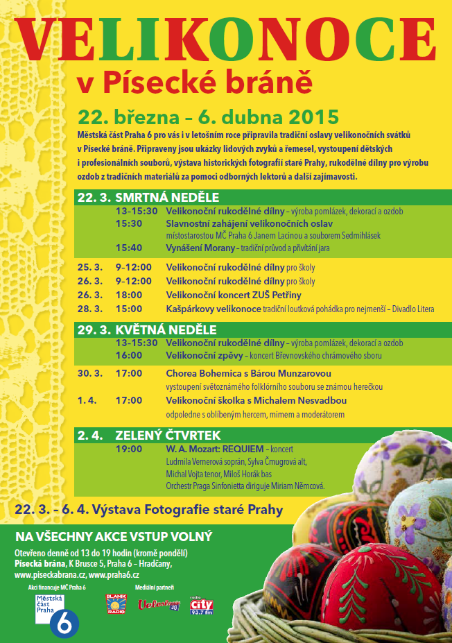 Akce v rámci oslav velikonočních svátků v Písecké bráně. Až do 6. dubna je pro vás připraven bohatý program složený z ukázek lidových zvyků a řemesel, vystoupení dětských i profesionálních souborů, rukodělné dílny nebo výstava historických fotografií staré Prahy.