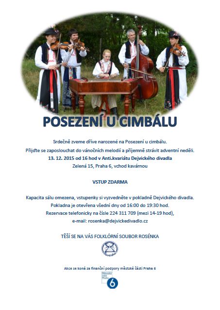 Srdečně zveme dříve narozené obyvatele Prahy 6 na posezení u cimbálu, kde zazní známe i méně známe vánoční koledy. Přijďte strávit adventní neděli do Anti.kvariátu Dejvického divadla, vchod kavárnou. Začátek programu je v 16 hod. VSTUP ZDARMA!