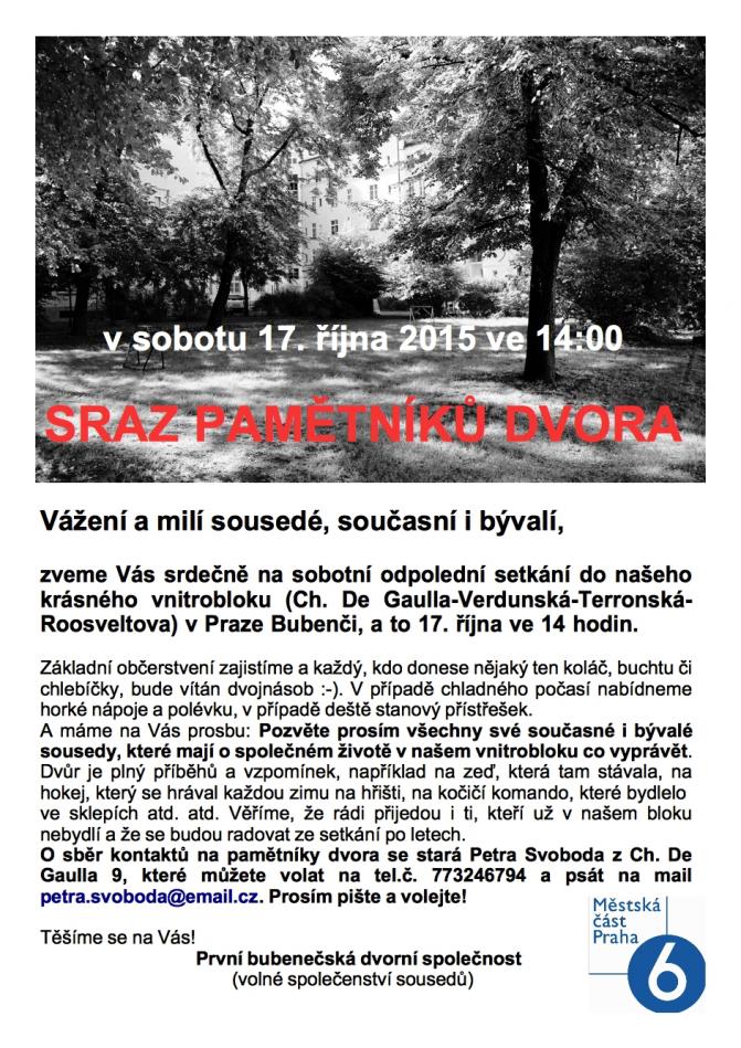 V sobotu 17. října ve 14:00 pořádá První bubenečská dvorní společnost odpolední setkání stávajících a bývalých sousedů, kteří užívají, či kdysi užívali společný vnitroblok mezi ulicemi Verdunská, Terronská, Rooseveltova a Ch. De Gaulla.