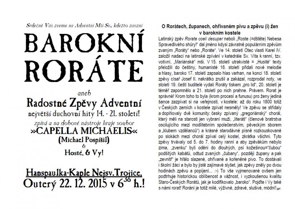 Latinský zpěv Rorate coeli desuper neboli „Roste (=dštěte) Nebesa Spravedlivého shůry!“ dal jméno kdysi závratně populárním zpěvům zvaným „Roráty“ nebo „Roráte“. Ve 14. století Otec vlasti Karel IV. založil nadaci na latinské zpívání v katedrále Sv. Víta k ranní, tzv. votivní, „Mariánské“ mši. V 15. století utrakvisté = „Husité“ texty přeložili do češtiny, humanisté 16. století přidali nové melodie a hlasy, baroko 17. století zapsalo hlas varhan, na konci 18. století zpěvy císař Josef II. nakrátko zrušil a zakázal, rozprodal noty, ve století 19. čeští buditelé vydali Roráty tiskem „pro lid“, 20. století je téměř zapomnělo a 21. století po nich prahne. Právem. Rorat je správné! Krom toho to byla (krom procesí a funusu) pro ženy jediná šance zazpívat si na veřejnosti, v kostele: až do roku 1800 totiž v Českých zemích v kostele zpívat nesměly! Ve zpěvu se střídaly a doplňovaly dvě komunity: česky zpívaný „gregoriánský“ chorál, který měli na starosti jen vybraní muži, „literáti“ (členové bratrstva oscilujícího mezi modlitebním společenstvím, pěveckým sborem a „klubem vzdělanců“) a krásné starodávné písně rozkouskované po slokách mezi chorál zpíval celý kostel, zkrátka všichni. Tyto zpěvy trvávaly od 5. do 7. hodiny ranní a aby zpěvákům nebylo zima, „zvenku“ byli oděni do dlouhých, psí kožešinou=“čubou“ podšitých kabátů, odtud zvaných „čubany“, později župany a pak „zevnitř“ je hřálo slazené, ohřívané a kořeněné pivo. To dostávali i školní žáci a bylo by jistě zajímavé slyšet, jak zpěvy zněly po dvou hodinách zpěvu a popíjení... :-) To vše vyjmenované ovšem jen podtrhuje historickou oblíbenost a vážnost, i vyzkoušenou kvalitu Staro-Českých Rorátů, jak je kodifikovalo „baroko“. Pojďte i Vy také s námi rorat! Rorání je totiž milé, výživné, zdravé, slušivé, módní! MP.