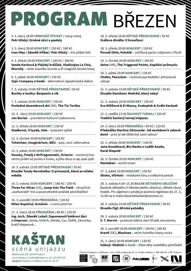 Březnový program v Kaštanu zde a hned 3. 3. vás srdečně zveme na koncert Ivana Hlase, Zdeňka Hříbala a Petra Hilského – trio přátel 3xH a k tomu vernisáž výstavy Petra Hilského. Dále nás v březnu čekají koncerty různých žánrů, pohádky, přednášky a tentokrát i dětský bazárek.