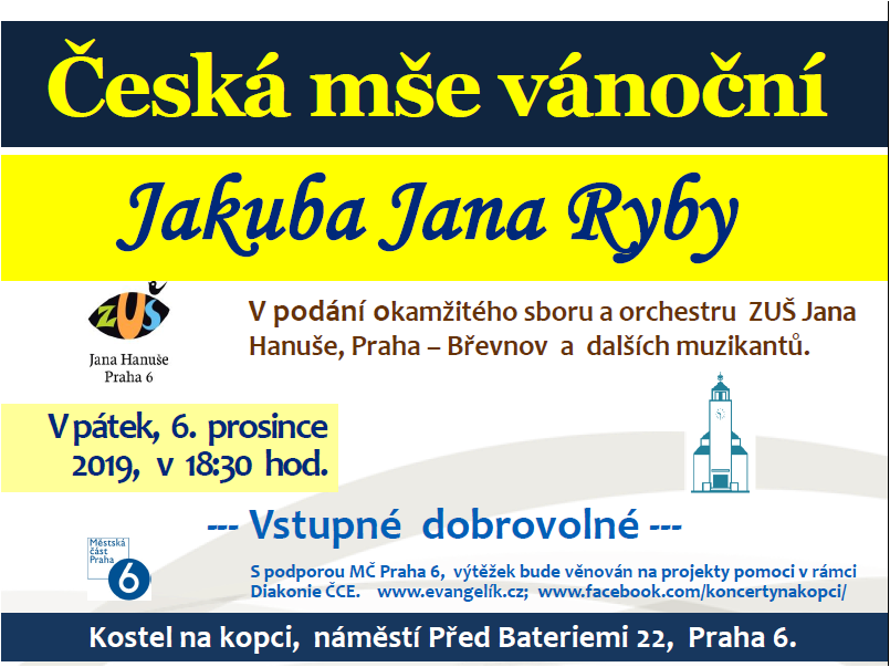 Jako již tradičně, v rámci Koncertů na kopci a společně se ZUŠ Jan Hanuše, si v předvánočním čase můžete poslechnout Českou mši vánoční Jakuba Jana Ryby. Vstupné dobrovolné. Srdečně zveme!