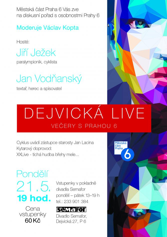 Zveme vás na populární diskusní setkání DEJVICKÁ LIVE s významnými osobnostmi Prahy 6, které se uskuteční v pondělí 21. května 2018 od 19.00 hodin v Divadle Semafor.