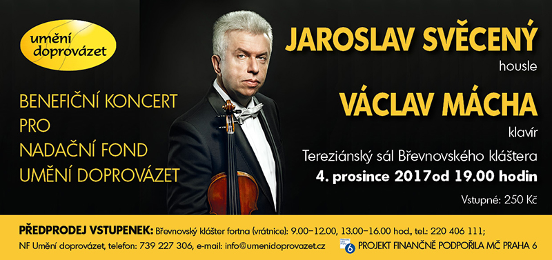 Nadační fond Umění doprovázet vás srdečně zve na benefiční koncert houslového virtuosa Jaroslava Svěceného, který pro nadační fond vystoupí za doprovodu klavíristy Václava Máchy v pondělí 4. prosince 2017 v Tereziánském sále Břevnovského kláštera.