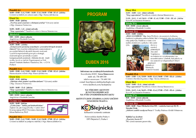 V programu Komunitního seniorského centra Šlejnická (ul. Šlejnická 5), ve kterém naleznete různé aktivizační programy jako přednášky, cvičení, hudební programy... Aktivity jsou určeny pro seniory městské části Praha 6 a jsou zdarma. Místa je lépe si zarezervovat na tel. čísle: 736 489 330 u koordinátorky komunitního centra pí Simeonové.