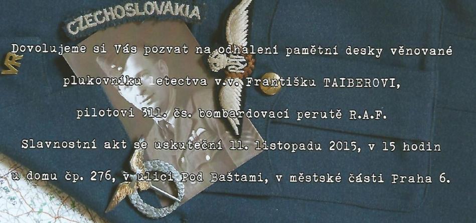 Dovolujeme si Vás pozvat na odhalení pamětní desky věnované plukovníku letectva v.v. Františku TAIBEROVI, pilotovi 311. čs.bombardovací perutě R.A.F. Slavnostní akt se uskuteční 11. listopadu 2015, v 15 hodin u domu č.p. 276, v ulici Pod Baštami, v městské části Praha 6.