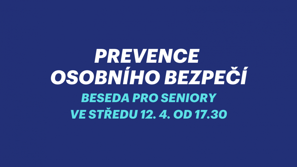 Beseda pro seniory se zástupcem Městské policie o zásadách chování vůči neznámým osobám. Senioři obdrží preventivní materiál (osobní alarm, zarážka za dveře s alarmem, minialarm na okna a dveře, brožury, letáky, samolepky). Akce je zdarma.