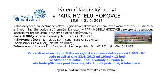 Týdenní léčebný lázeňský pobyt v PARK HOTELU HOKOVCE v termínu od 15.9. 2013 do 21.9.2013. Doprava je zajištěna autobusem z Prahy do místa pobytu. Více v příloze.