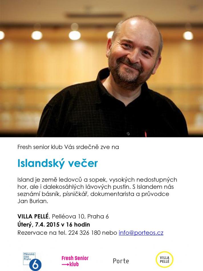 Fresh senior vás srdečně zve na Islandský večer s Janem Burianem 7.4.2015 od 16 hodin do galerie Villa Pellé. Kapacita sálu je omezena.