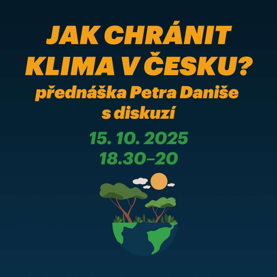 Pro zastavení změny klimatu je třeba přestat vypouštět skleníkové plyny do atmosféry. Jaké jsou cesty k zásadnímu snížení emisí v Česku? Lze to udělat bez ohrožení kvality života lidí? A jak můžeme chránit klima sami? Na tyto otázky se pokusí odpovědět přednáška a následná diskuze s Petrem Danišem, analytikem v think tanku Fakta o klimatu. Petr Daniš vedl pracovní skupinu ke klimatickému vzdělávání pod Radou vlády pro udržitelný rozvoj.  Za svou knihu Klima je příležitost obdržel Čestnou cenu za komunikaci změny klimatu.