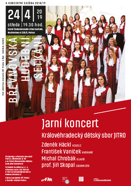Královéhradecký dětský sbor Jitro se brzy po svém založení v roce 1973 prodral mezi absolutní českou i světovou špičku ve svém oboru. Svědčí o tom nejen mnoho ocenění z mezinárodních soutěží, ale i pravidelná pozvání do USA (od roku 1990 zde byl na 12 turné!) a dalších zemí celého světa. Pro koncert 4. koncertní sezóny Břevnovská hudební setkání, který se poprvé uskuteční v Kostele Českobratrské církve husitské v Wuchterlově ul. 5, vybral sbormistr prof. Jiří Skopal pestrý repertoár od A. Vivaldiho přes J. Brahmse až k B. Martinů či P. Ebenovi. Spoluúčinkují Zdeněk Häckl - housle, František Vaníček - varhany a Michal Chrobák - klavír. Prodej vstupenek v Informační kanceláři Praha 6, Bělohorská 110, ve fortně Břevnovského kláštera a hodinu před koncertem v místě konání.