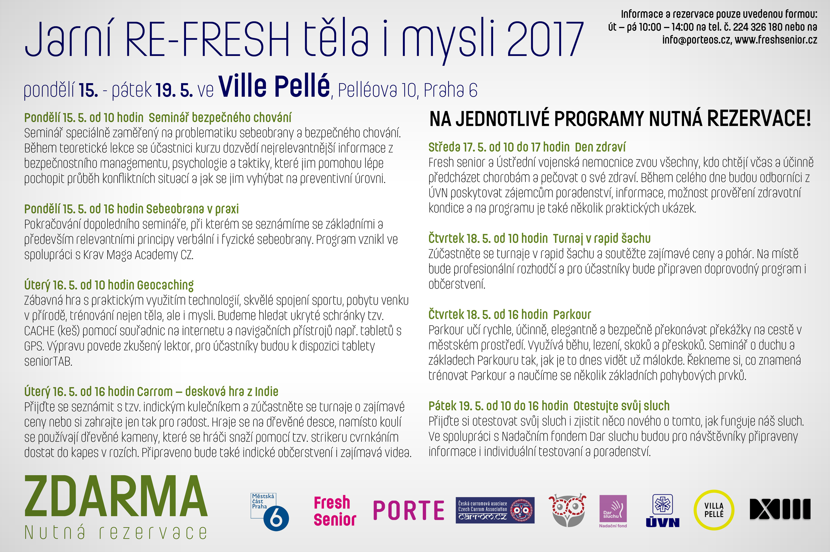Jarní RE-FRESH těla i mysli 2017 se uskuteční dne 15. - 19.5.2017 ve Ville Pellé, na adrese: Pelléova 10, Praha 6. Na jednotlivé programy je nutná rezervace na tel: 224 326 180 nebo na info@porteos.cz.