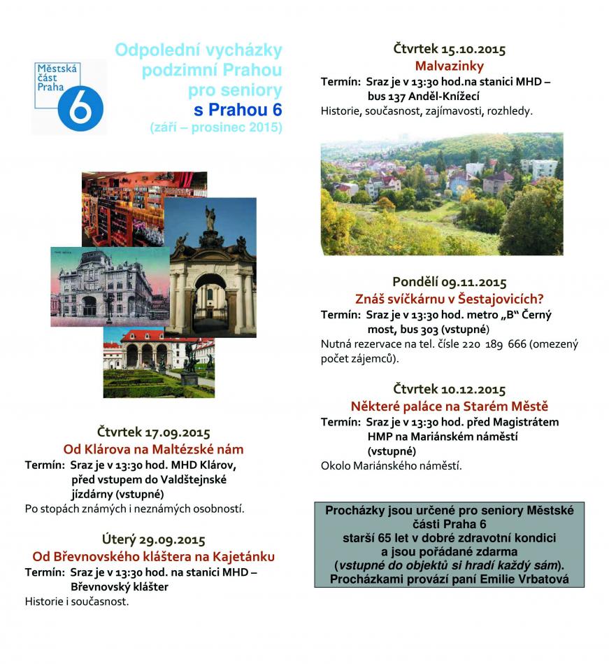 Procházky jsou určené pro seniory Městské části Praha 6 starší 65 let v dobré zdravotní kondici a jsou pořádané zdarma (vstupné do objektů si hradí každý sám).
