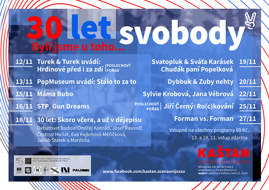 Sérií pořadů, vztahujících se ke kulatému výročí Listopadu 1989, se chce i klub Kaštan připojit k poděkování za třicet let svobodného fungování společnosti. Navzdory všem problémům současnosti si totiž myslíme, že je co slavit.