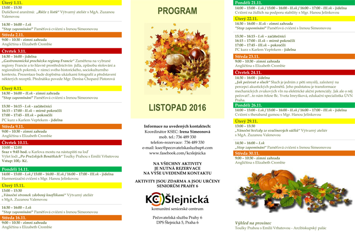 V programu Komunitního seniorského centra Šlejnická (ul. Šlejnická 5, Praha 6) na listopad 2016 naleznete různé aktivizační programy jako odborné kurzy,paměťová cvičení, výuka anglického jazyka. Aktivity jsou určeny pro seniory městské části Praha 6 a jsou zdarma. Místa je lépe si zarezervovat na tel. čísle: 736 489 330 u koordinátorky komunitního centra pí Simeonové.