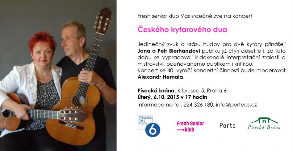 Fresh senior klub vás srdečně zve na koncert Českého kytarového dua do Písecké brány v úterý 6. října v 17 hodin. Koncert ke 40. výročí koncertní činnosti bude moderovat Alexandr Hemala. V průběhu večera bude Janě a Petrovi Bierhanzlovým předán agenturou Dobrý den certifikát o zápisu do knihy českých rekordů jako nejdéle působícímu klasickému kytarovému duu. Koncert je věnován občanům Prahy 6.