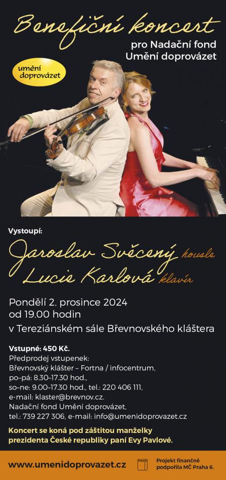 Nadační fond Umění doprovázet vás srdečně zve na tradiční koncert houslového virtuosa Jaroslava Svěceného, který pro nadační fond vystoupí za doprovodu klavíristky Lucie Karlové v pondělí 2. prosince 2024 v Tereziánském sále Břevnovského kláštera.