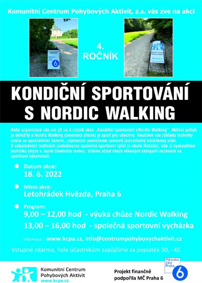 V letošním roce naše organizace pořádá již 4.ročník projektu "Kondiční sportování s Nordic Walking". Naším cílem je ukázat veřejnosti, že hole pro Nordic Walking a sním spojená severská chůze může pomoci při tréninku vrcholovým sportovcům, pro amatérské sportovce jako vhodný způsob aktivního pohybu. Lze jej využít i pro rehabilitaci po operačních zásazích. Je vhodný pro seniory s nižší hybností pohybového aparátu.