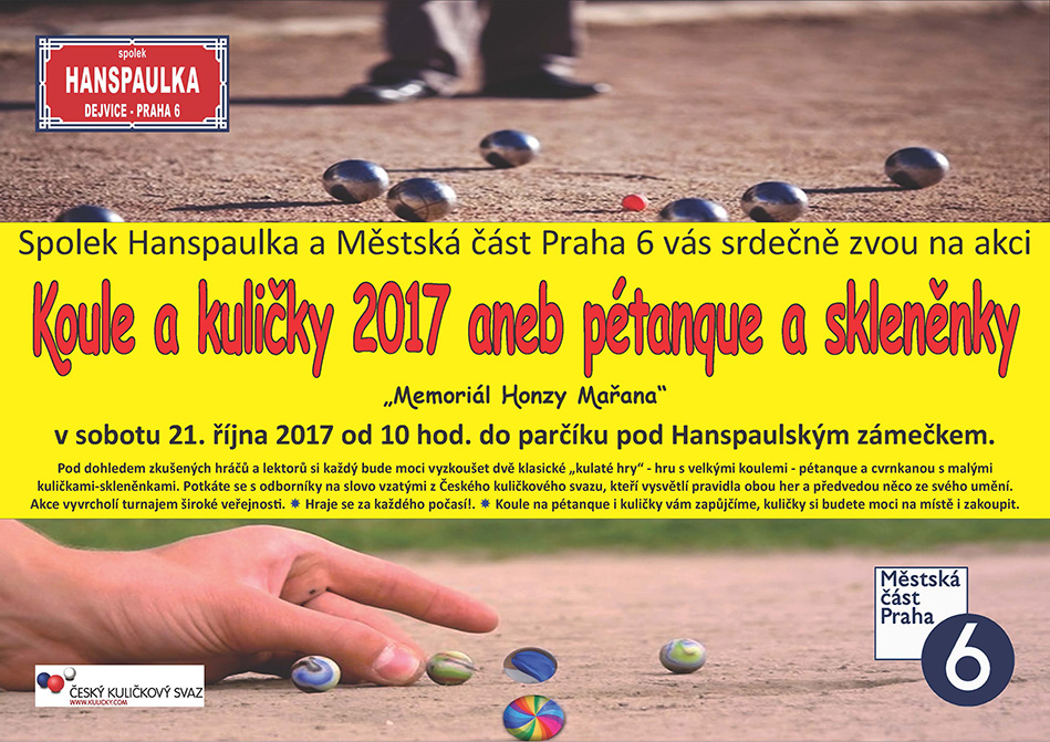 Spolek Hanspaulka a Městská část Praha 6 srdečně zvou na akci „Koule a kuličky 2017 aneb pétanque a skleněnky“. V sobotu 21. října 2017 od 10 hod. bude parčík pod Hanspaulským zámečkem dočasnou mekkou všech zájemců o tyto velmi staré sporty. Akce nese podtitul „Memoriál Honzy Mařana“ na památku významného členu spolku, který celou akci vymyslel…
