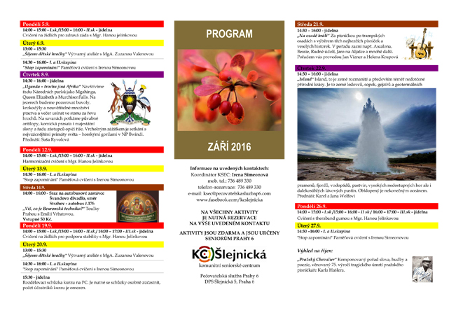 V programu Komunitního seniorského centra Šlejnická (ul. Šlejnická 5, Praha 6), ve kterém naleznete různé aktivizační programy jako přednášky, cvičení, hudební programy... Aktivity jsou určeny pro seniory městské části Praha 6 a jsou zdarma. Místa je lépe si zarezervovat na tel. čísle: 736 489 330 u koordinátorky komunitního centra pí Simeonové.