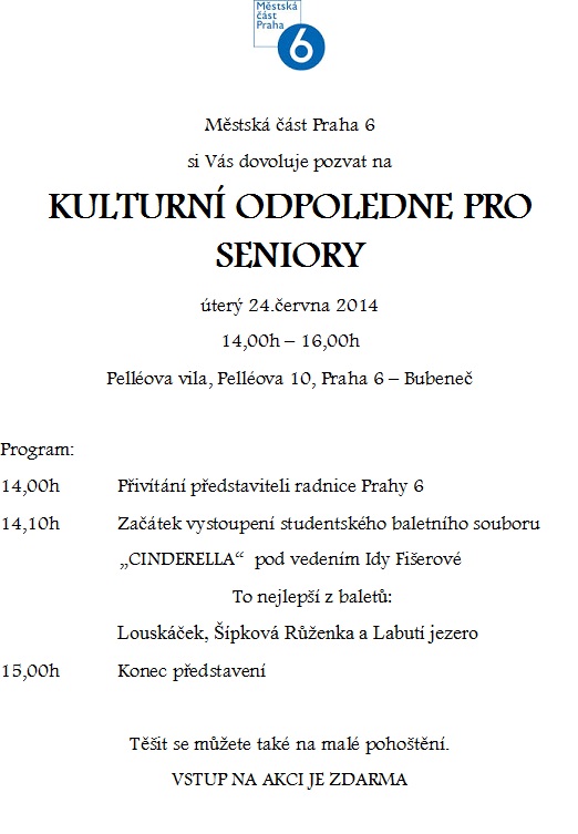 Městská část Praha 6 si Vás dovoluje pozvat na kulturní odpoledne pro seniory.