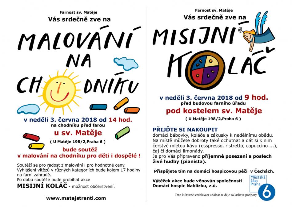 Na chodníku před farou sv. Matěje se bude tradičně soutěžit v malování. Soutěž o hodnotné ceny je určena dětem i dospělým. Vyhlášení vítězů v různých kategoriích bude kolem 17 hod. Občerstvení u stánku "misijní koláč" (už od rána), kde si můžete koupit domácí koláče, bábovky a dorty k nedělnímu obědu či svačině nebo je ochutnat na místě, dále různé druhy čerstvě mleté kávy, čaje a domácí limonády. Možnost posezení s živou hudbou. Výtěžek akce bude věnován české hospicové péči - domácí hospic Nablízku z.ú.