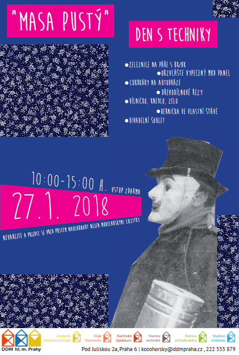 Dovolujeme si vás pozvat na masa pustou žranici, kde budeme podávat jízdy na autodráze či si budete moci pochutnat na železničním kolejišti a MHD panelu. Zakousnout do práce v dřevodílně nebo do masopustní dílničky. Jako dezert nabídneme herničku pro nejmenší. Třešničkou na dortu pak bude divadelní šou(let) s několika efektními přílohami.