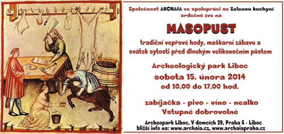 MASOPUST - tradiční vepřové hody, maškarní zábava a svátek sytosti před dlouhým velikonočním půstem. Pořádané v areálu Archeologického parku Liboc v sobotu 15. února 2014 od 10,00 do 17,00 hod.
