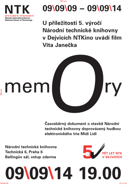 V rámci připomenutí pěti let NTK v Dejvicích NTKino uvádí dokumentární film Víta Janečka z roku 2010 o stavbě Národní technické knihovny. Součástí programu je také komentovaná prohlídka knihovny, která odstartuje v 19:45 před Ballingovým sálem.