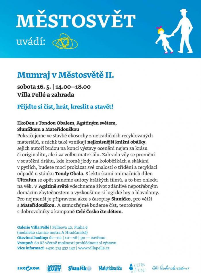 Pokračujeme ve stavbě ekosochy z netradičních recyklovaných materiálů, z nichž také vznikají nejkrásnější knižní obálky. Jejich autoři budou na konci výstavy oceněni nejen za krásu či originalitu, ale i za volbu materiálu. Zahrada vily se promění v soutěžní dráhu, kde kromě jízdy na koloběžkách a skákání v pytlích, budete moci prokázat své znalosti o třídění a recyklaci odpadů u stánku Tondy Obala. Slektorkami animačních dílen Ultrafun se opět staneme autory krátkých filmů, a to bez ohledu na věk. V Agátině světe vdechneme život zdánlivě nepotřebným domácím zbytečnostem a vyzkoušíme si logické hry a hlavolamy. Pro nejmenší je připravena akce s časopisy Sluníčko, pro větší s Mateřídouškou. A samozřejmě budeme číst, tentokráte s dobrovolníky z kampaně Celé Česko čte dětem.