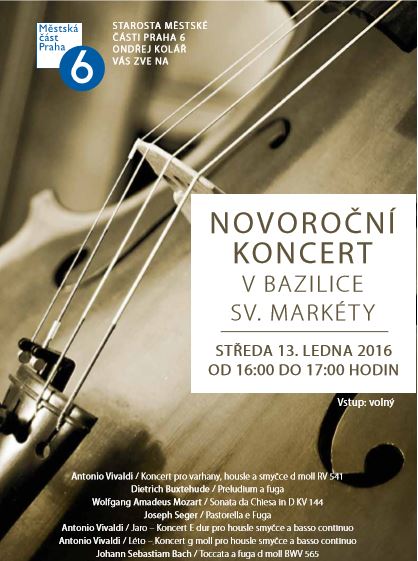 Starosta městské části Praha 6 Ondřej Kolář Vás zve na Novoroční koncert v Bazilice sv. Markéty břevnovského kláštera, a to ve středu 13. ledna od 16 do 17 hodin. Vstup volný.