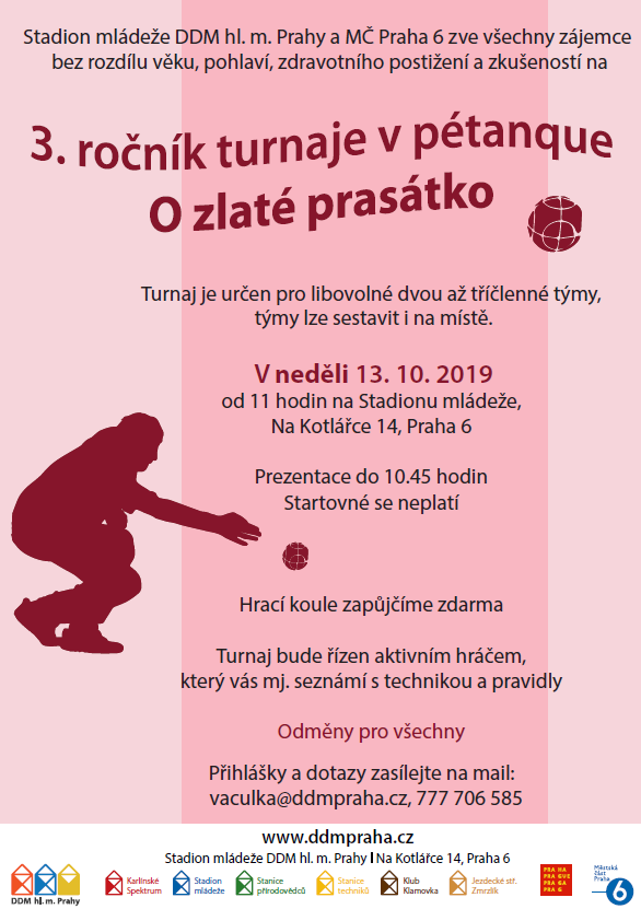 Stadion mládeže DDM hl. m. Prahy a MČ Praha 6 zve všechny zájemce bez rozdílu věku, pohlaví, zdravotního postižení a zkušeností na 3. ročník turnaje v pétanque - O zlaté prasátko.