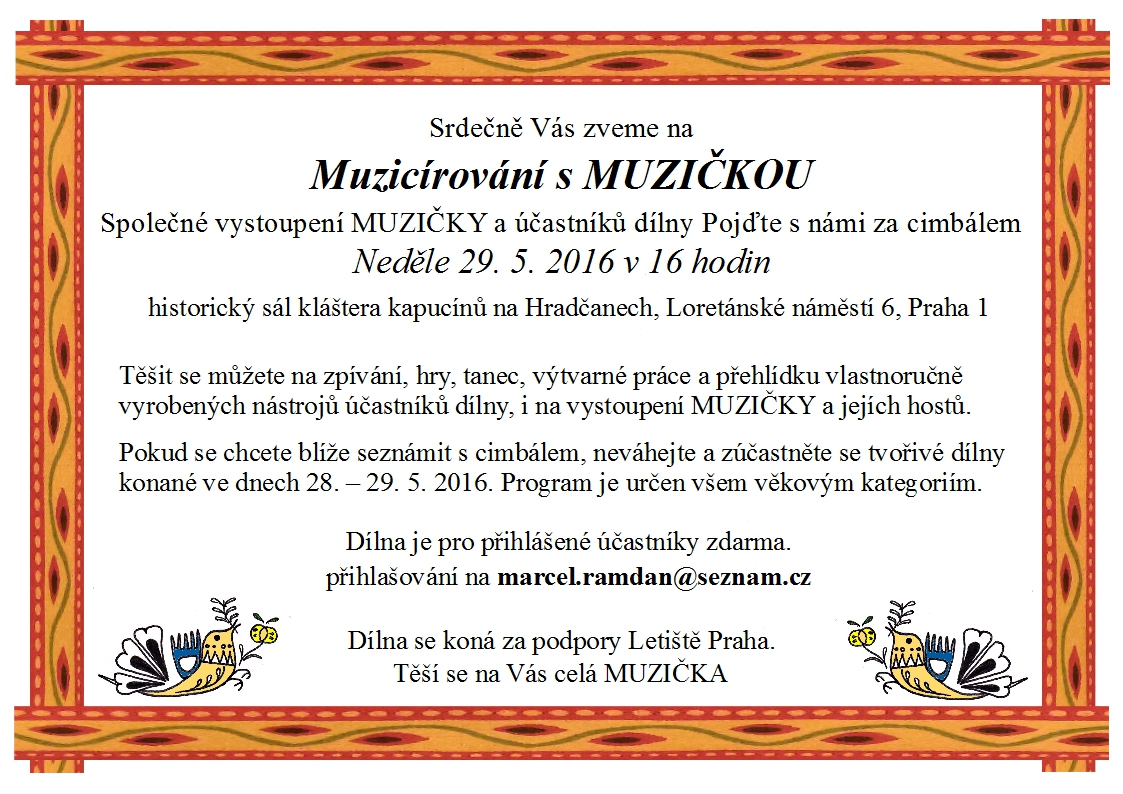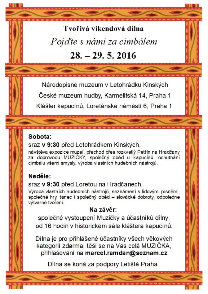 Přijďte 28.-29. května na tvořivou dílnu. Budeme si hrát, zpívat, povídat, ochutnáme cimbálové i slovácké dobroty.
