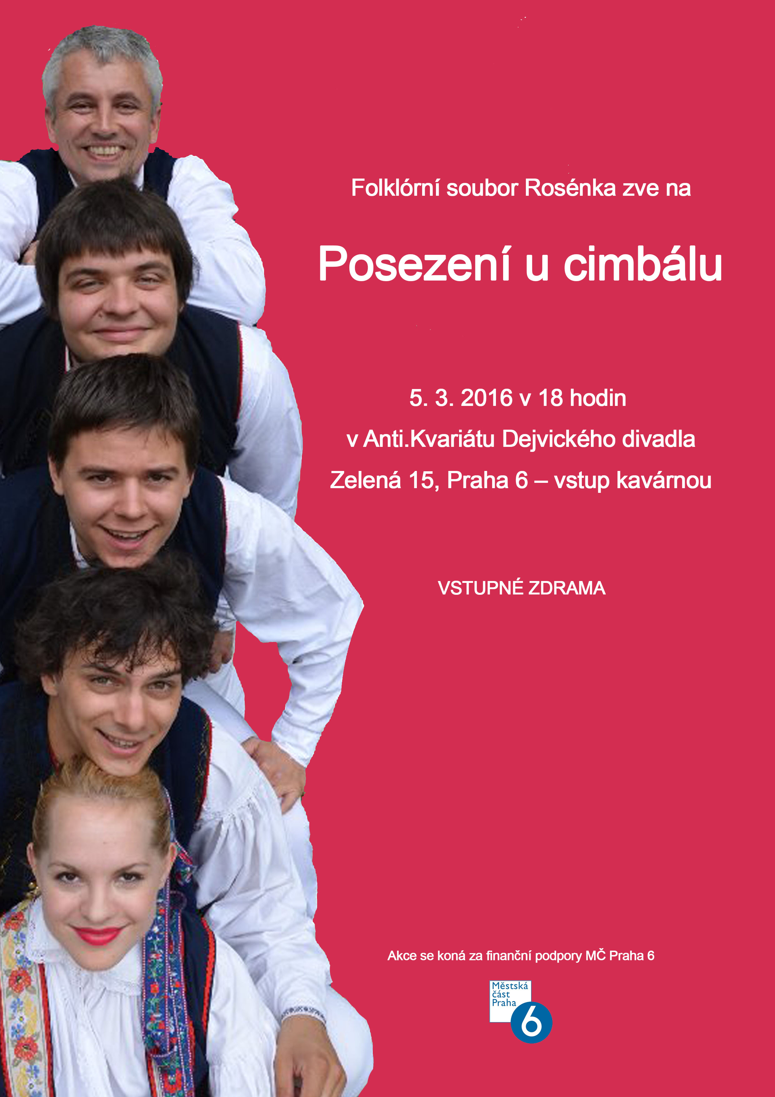 Posezení u cimbálu pro staré i mladé, babičky i dětičky. Přijďte si s námi zazpívat a posedět do Ani.Kvariátu Dejvického divadla, vchod kavárnou. Začínáme v 18:00, vstup zdarma! Kapacita sálu je omezena, proto si svá místa rezervujte předem na telefonním čísle 224 311 709 (mezi 14-19 hod) nebo přes email rosenka{zavináč}dejvickedivadlo{tečka}cz