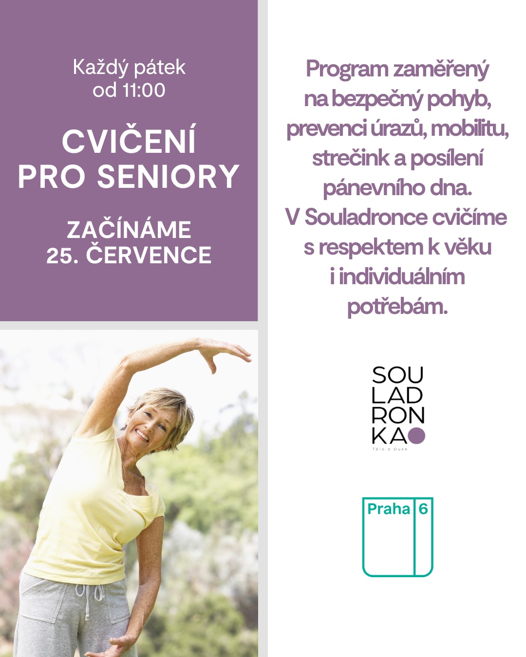 Pohybové lekce zaměřené na bezpečné a zdravé cvičení pro ženy v seniorském věku je možné navštěvovat pravidelně každý pátek v 11 hodin ve stylovém prostředí studia SouLadronka v usedlosti Ladronka. Program je zaměřen také na prevenci úrazů a posílení pánevního dna, mobilitu a strečink. Cvičení probíhá s respektem k věku i individuálním potřebám v malých skupinkách. Díky finanční podpoře městské části je cvičení za zvýhodněnou cenu 120 korun a je určeno výhradně ženám. Přijďte spojit zdravý pohyb se společenským setkáním.