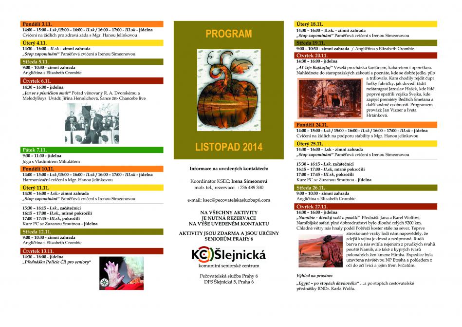 Program Komunitního seniorského centra KSEC Šlejnická na měsíc listopad, ve kterém najdete jak poutavé přednášky - pořady spojené s promítání či melodiemi pro dříve narozené, ale i rehabilitační cvičení či další aktivity. Srdečně zveme seniory Prahy 6.